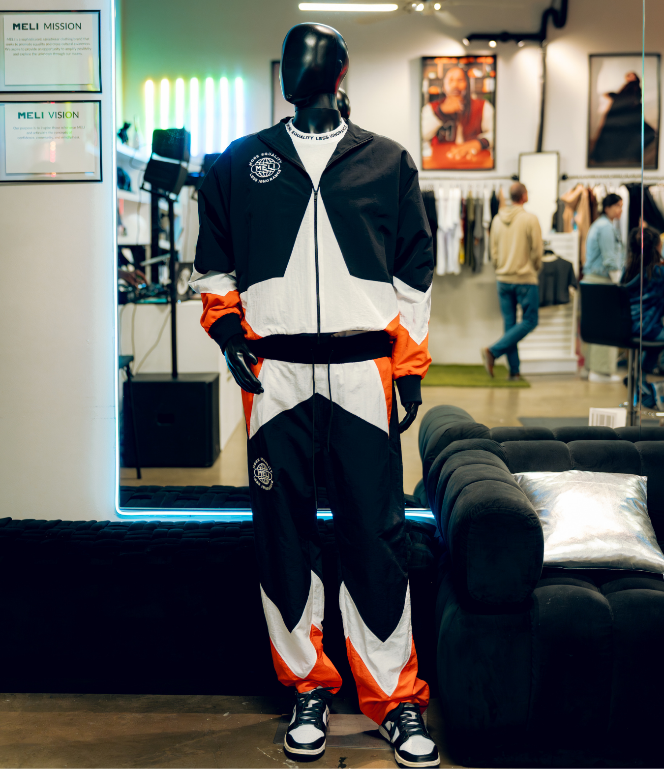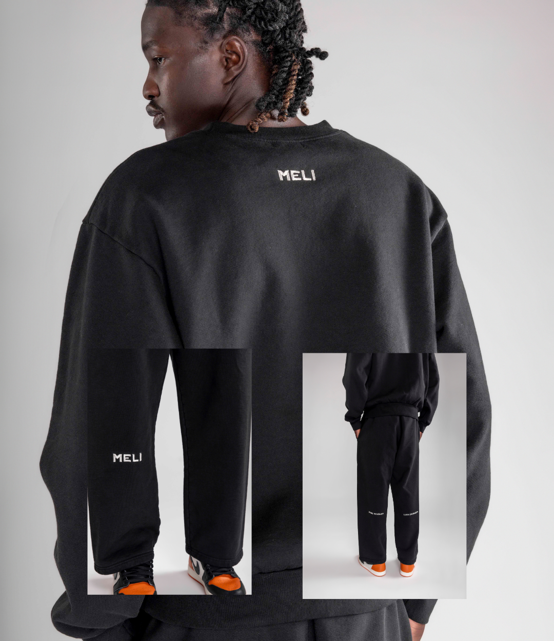 - The MELI TAGLINE CREWNECK + SWEATPANT: Black on black. Clean, sharp, dependable. It moves with you, no matter the weight you carry.