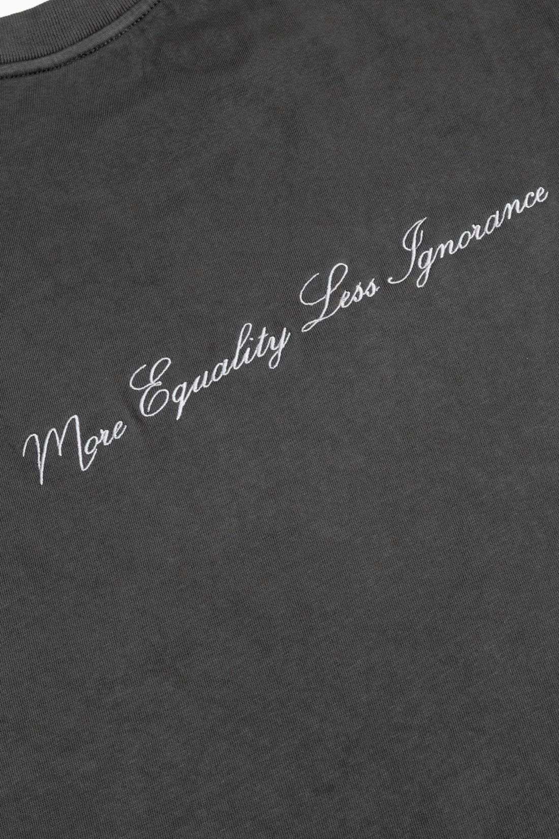 Pigment dyed through a process that creates subtle variations, making each tee unique. Finished with the MELI script logo embroidered at the front left chest and the MELI tagline More Equality Less Ignorance embroidered in script across the upper back.